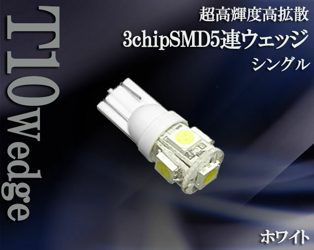 T10 超高輝度高拡散3chipSMD5連ウェッジシングル ホワイト ※1個販売! 数量限定につき、お一人様5球まで ◇超高輝度高拡散3chipSMD使用。