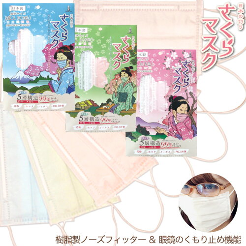 (一社)日本衛生材料工業組合連合会自主基準による表示 品名:立体5層構造マスク 日本製 対象:かぜ・花粉・ほこり等 素材 (本体・フィルタ)ポリプロピレン、ポリエステル、ポリエチレン (耳ひも)ポリエステル、ポリウレタン (ノーズフィッター)ポリエチレン 抗菌剤:銀系抗菌剤(表面の不織布より2層目に使用) マスクサイズ:160×90mm 販売者名:株式会社プレーリードッグ →メール便について詳しくはこちら日本をテーマにした5色の色鮮やかな『さくらマスク』。