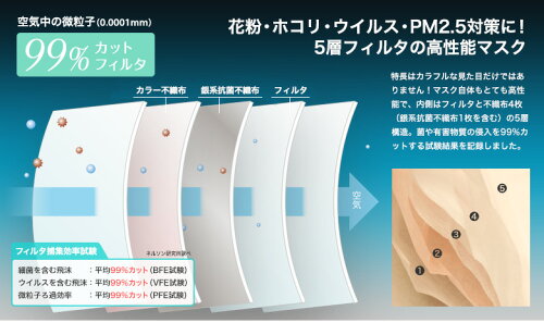 見た目だけでなく、5層構造で機能にもこだわったこのマスクは、空気中の微粒子を99%カット!毛羽立ちにくく、使い心地もさらっと快適です。