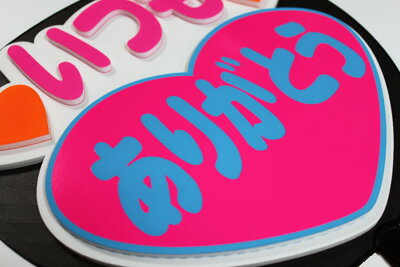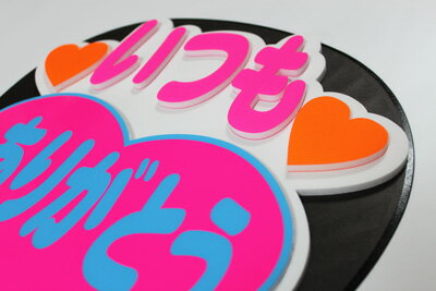 《立体メッセージ》 文字:いつもありがとう フォント:丸ゴ 配色: 「背景」→ホワイト 「文字」→蛍光ピンク 「ハートマーク抜き文字」→蛍光ピンク(シール) 「フチ」→ミルクブルー(裏) 「ハート」→蛍光オレンジ 《ジャンボうちわサイズ》 タテ:約285mm×ヨコ:約295mm 持ち手:約135mm ●注意● こちらの商品は配色、フォントの変更は致しておりません。